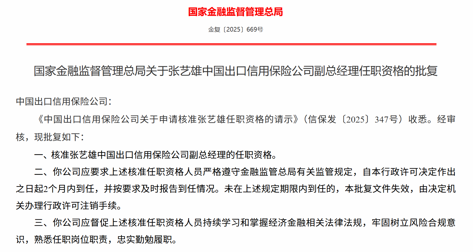 12月15日,国家金融监督管理总局发布关于张艺雄中国出口信用保险公司副总经理任职资格的批复,核准张艺雄中国出口信用保险公司副总经理的任职资格。